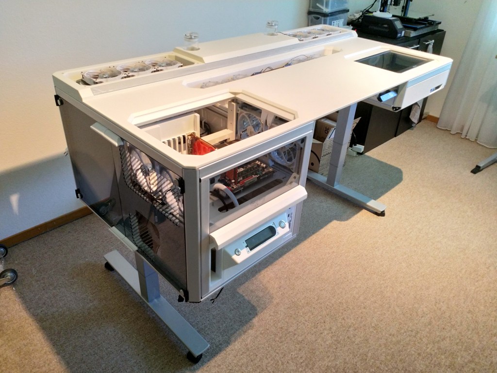 The paintjob on the desk top was done. I decided to go with a structural white painting in color code RAL9010 (standard white). The cool thing about the paint is that it has a powder-coated-like-look. Really happy how this turned out! Big thanks to the company supporting me there; Aeschbach & Co AG – they basically came up with the idea of using such a structured paint as their applying it also for server racks used by big telecommunication companies in Switzerland.