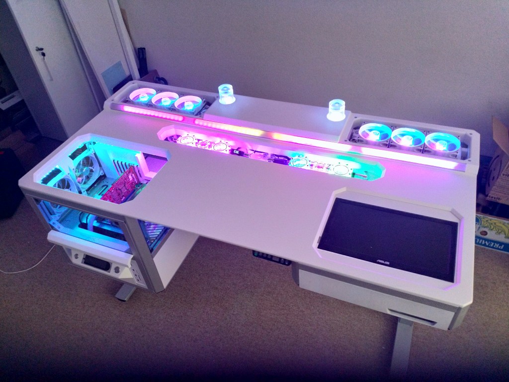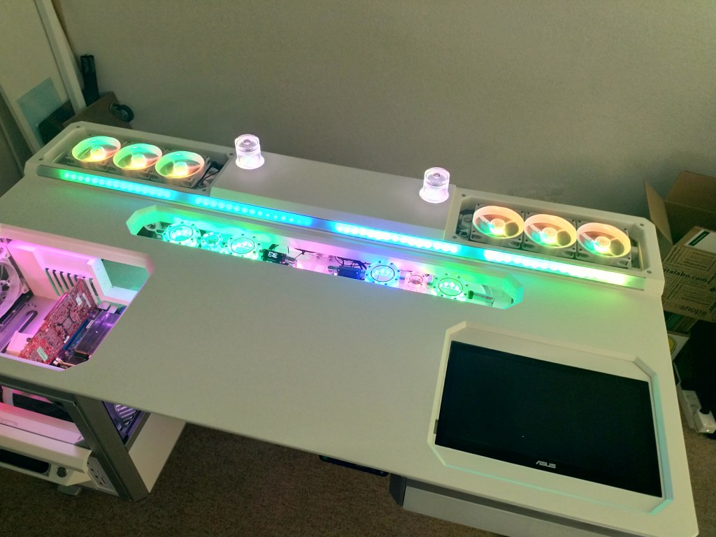 All the bigger parts of the desk are now more or less ready (only the top glass is missing. So I decided to play a bit around with the Aquacomputer RGB Controllers. I am almost happy with the result. The main bar in the middle will be replaced as I don’t like the gaps in between the strips. In addition I will search for a solution to diffuse the light in the PC chamber. But overall the concept works and looks quite amazing.