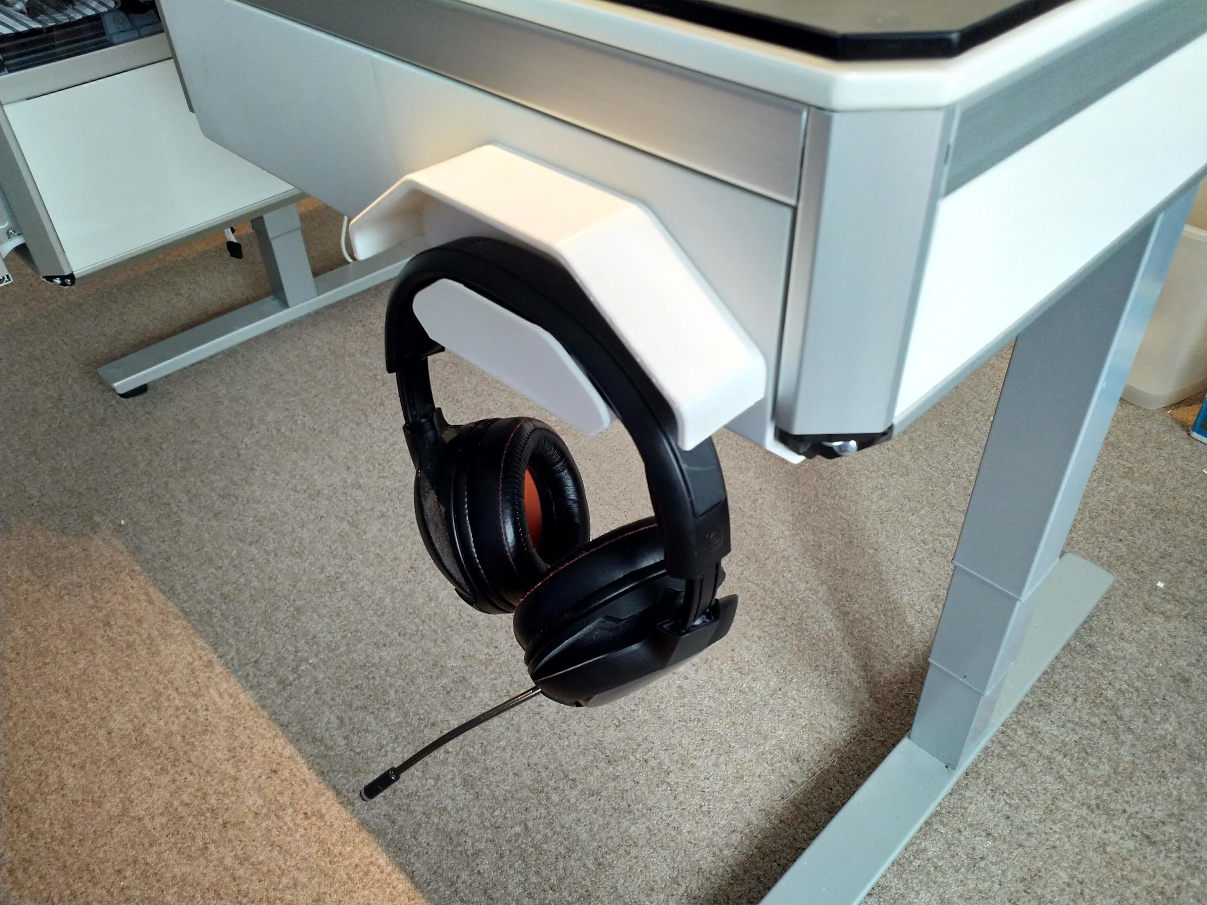 I finally had an idea how to fill the gap on the right drawer (initially the gap was planned to hold the display and buttons for the table lift. However I cancelled that approach as the routing of the cable for the lift would have been a nightmare and very clumsy. But then I had the idea that I still need a place to store my gaming headset. That’s what I ended up with: