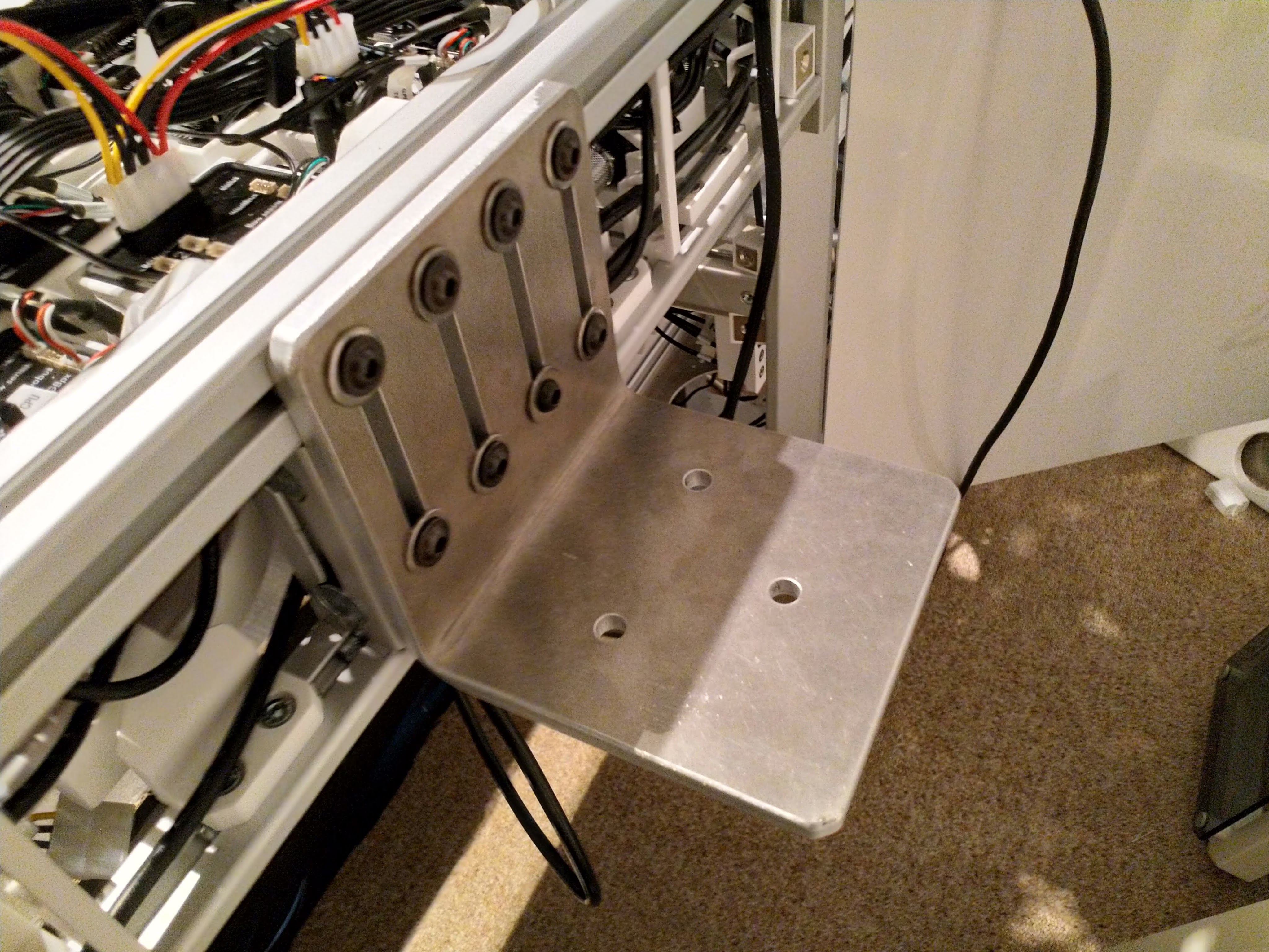 Standard Mounts are designed to be clamped or screwed on your desk. Unfortunately, the Desk-PC 2.0 is different. It doesn’t allow such a kind of mount because of the thick table top. I therefore designed an L-Bracket which is attached to the main frame construction. There are some benefits such as: