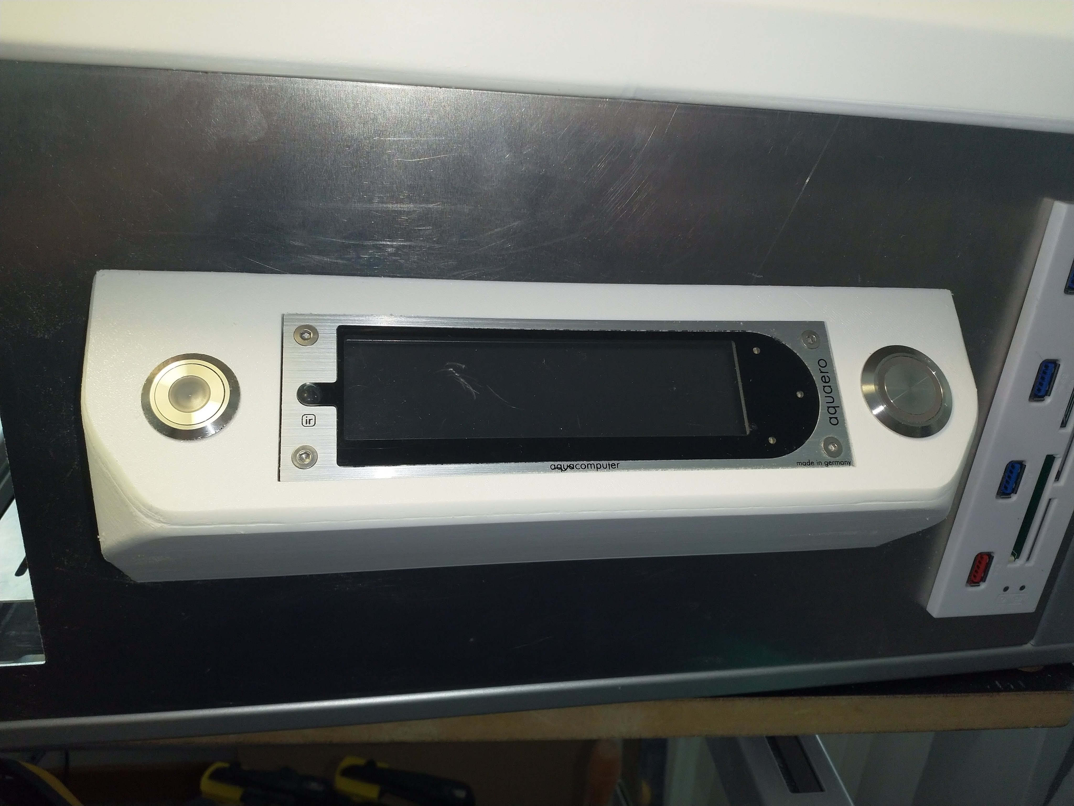 After receiving the aluminum parts I started to finalize and print the new front cover and mount for the Aquacomputer Aquaero. Here’s a preview of the 3D-Design: