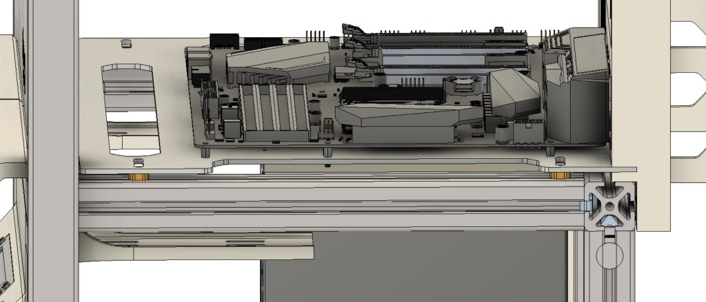 The Motherboard is installed to the ITEM frame using the standard ITEM T-Slot Nuts. There are 3D-designed spacers which are used to install the mother board with the correct distance to the frame.