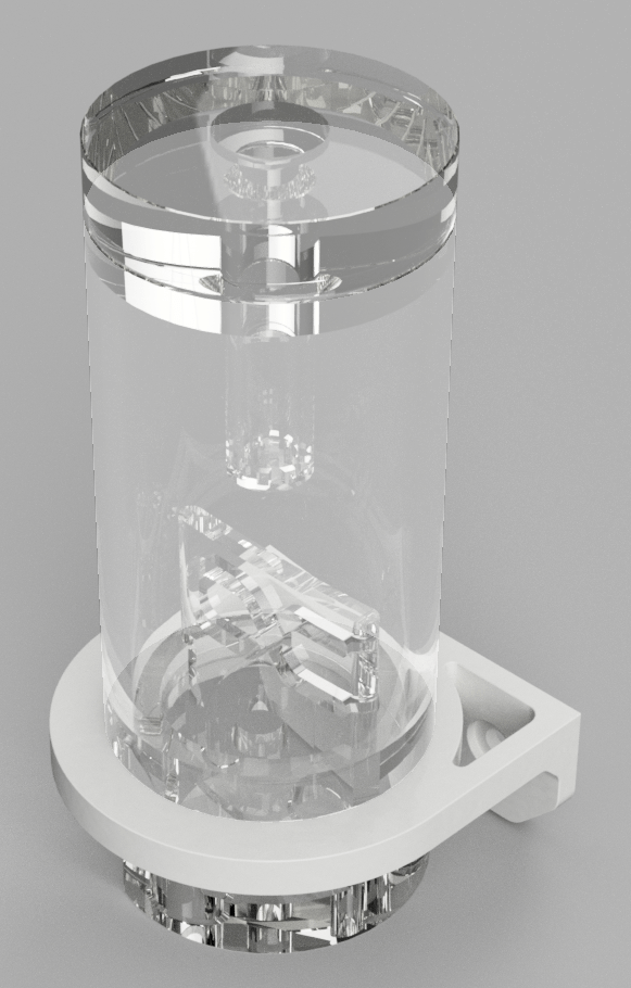This bracket is a bended aluminum sheet part. I found a company which offers a digital upload and preview of the parts. The water pump is installed by using rubber dampener screws. The bracket itself is mounted to main frame using ITEM t-slot nuts.