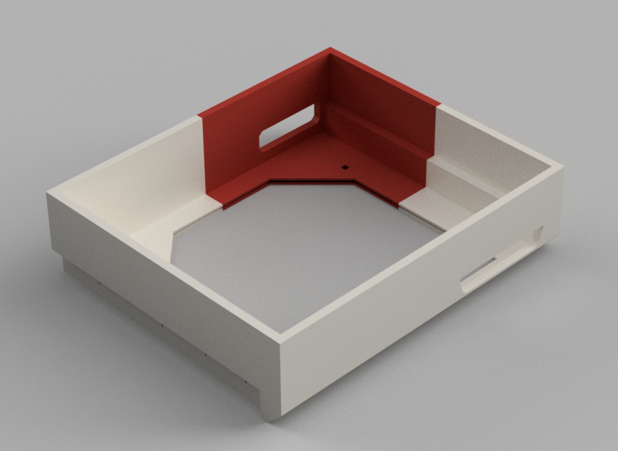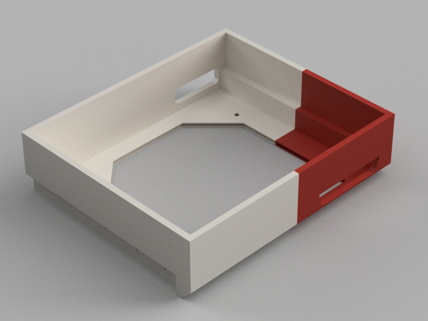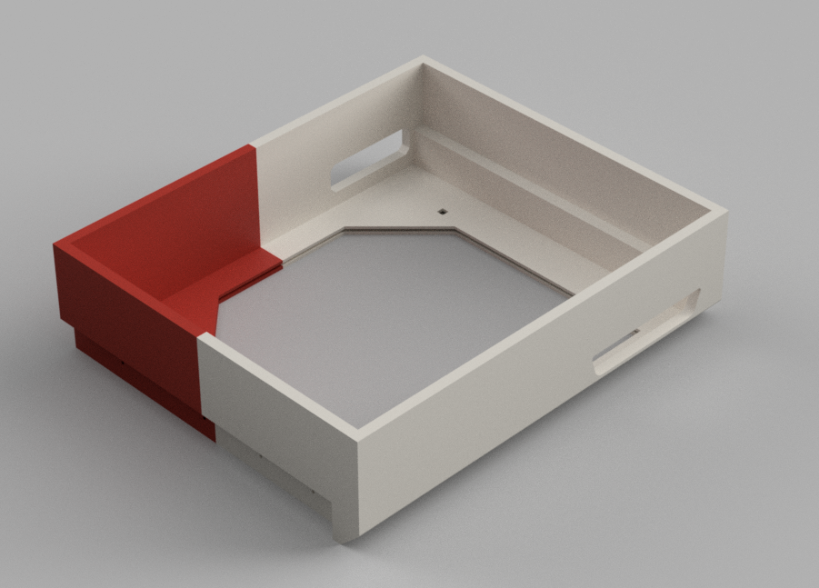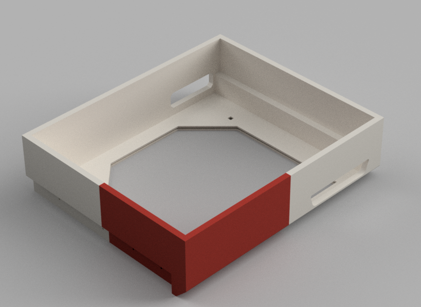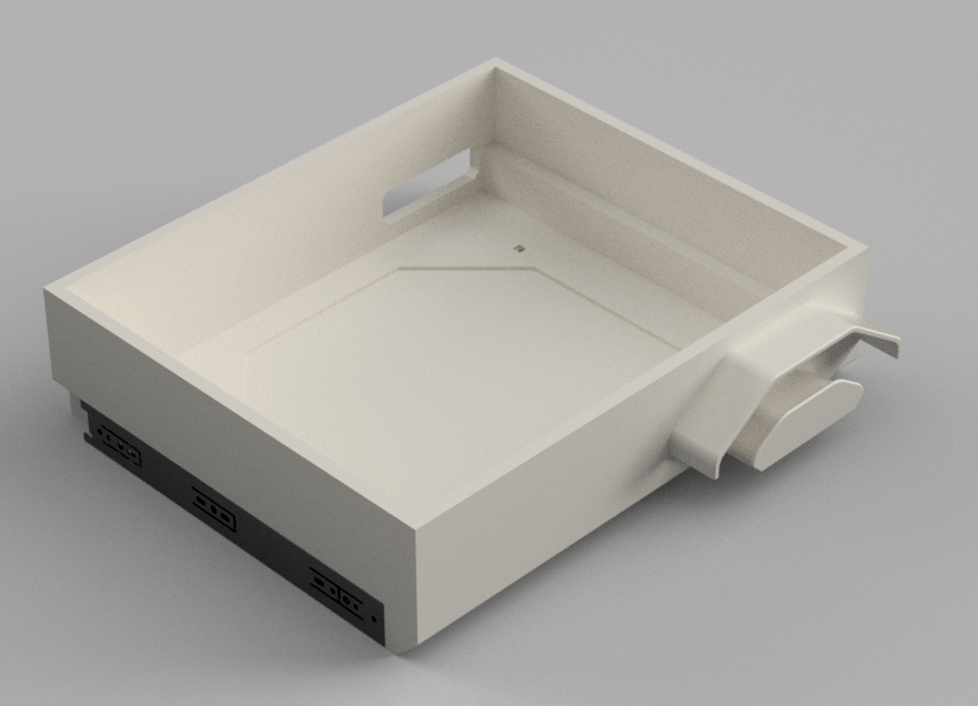 The right drawer is mainly made of four very big 3d printed parts and a metal base plate. With some wood working skills it could be also made of wood (I might be doing this as I will get access to a CNC machine). I initially made a cut out to hold the display for the table lift. However, I didn’t like the idea to route the cable for it through a drawer. So the alternative was to have a nice handle installed in the cutout.